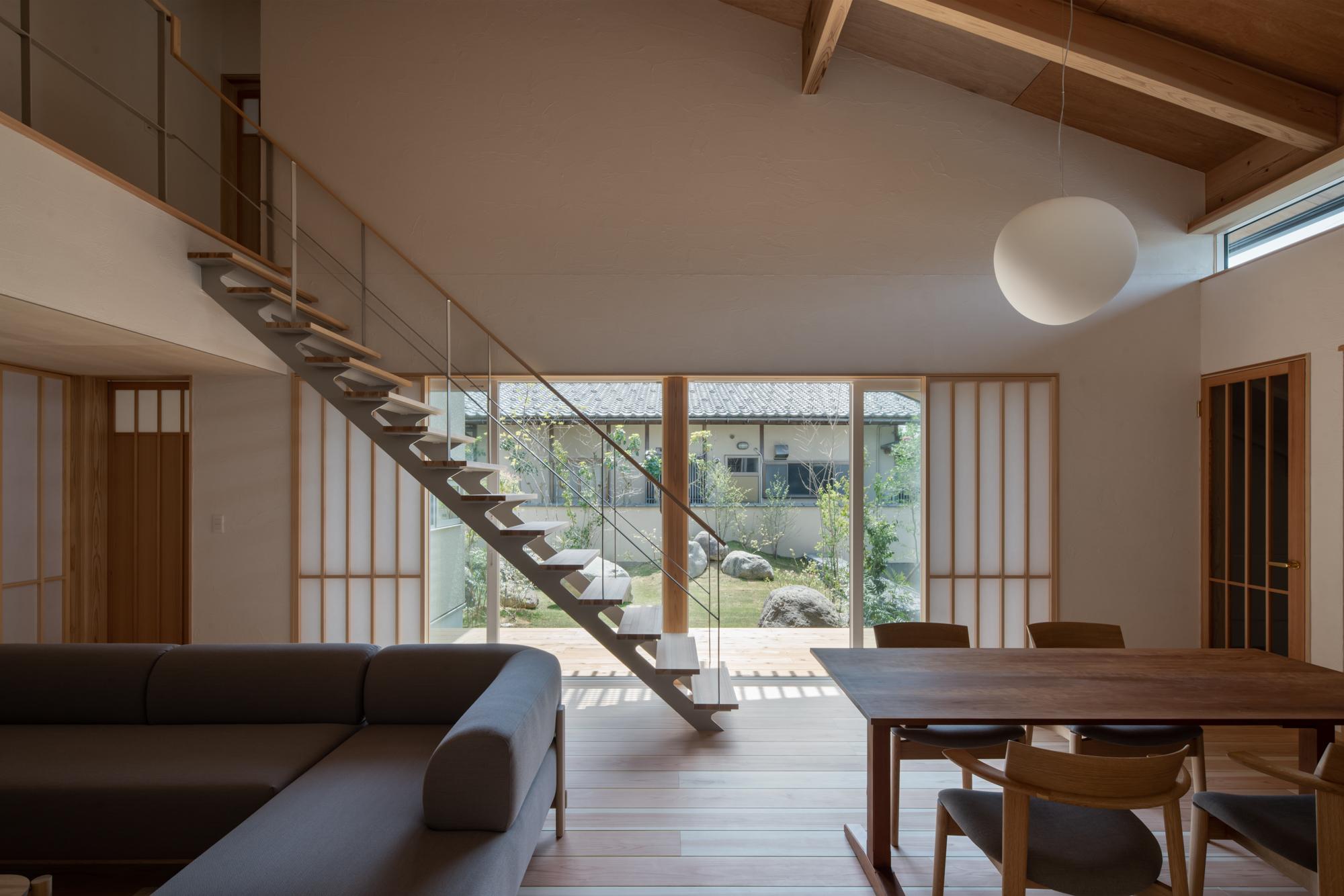 高低差を利用して、土地の傾斜に沿うように構成された住宅。 2つの屋根の隙間から差し込む光が塗り壁と木床にやさしく広がって、穏やかな時間が流れていました。(中村)